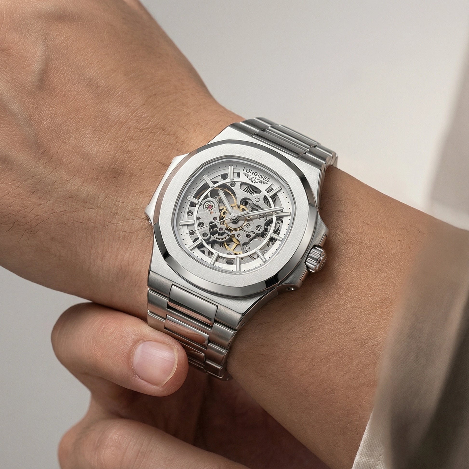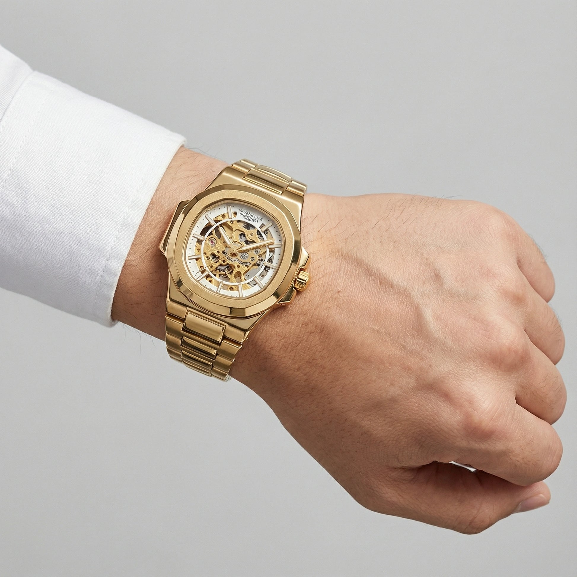 For the discerning gentleman who appreciates the finer details. This skeleton timepiece reveals the intricate dance of gears and springs beneath its crystal, offering a window into the soul of traditional watchmaking.