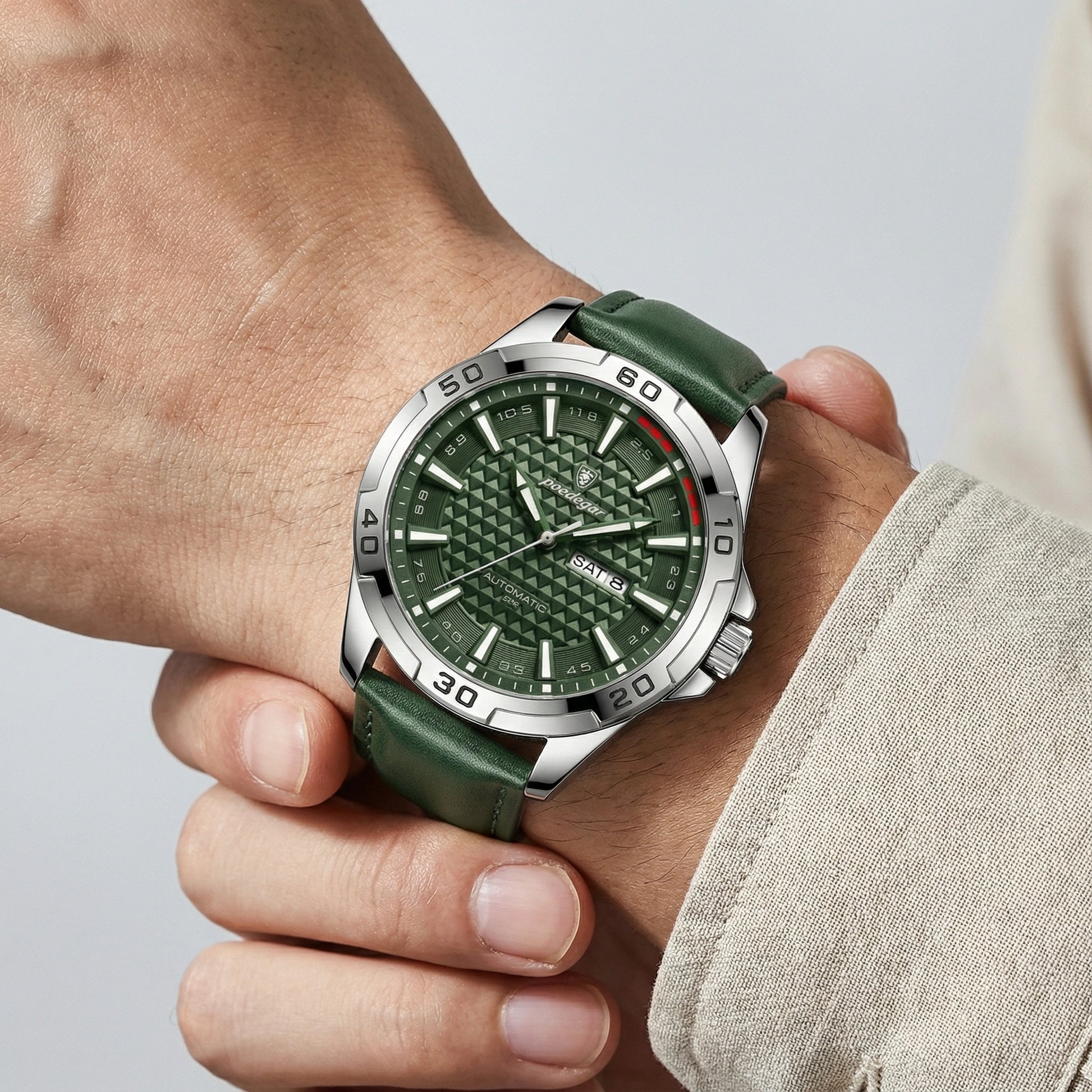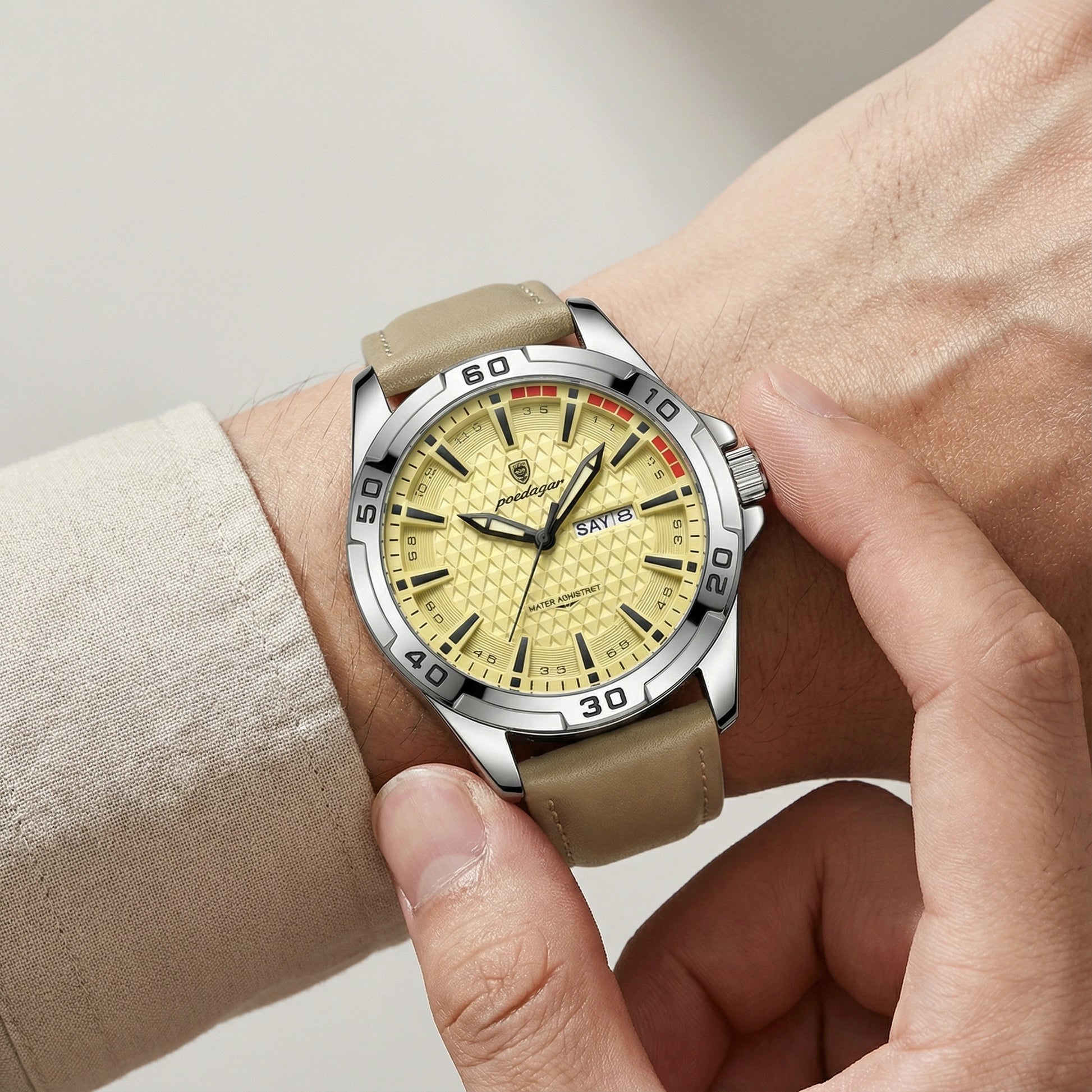 A refined timepiece that seamlessly transitions from boardroom to weekend pursuits. Built with a robust stainless steel case and finished with a supple genuine leather strap, this watch embodies understated elegance with purposeful functionality.